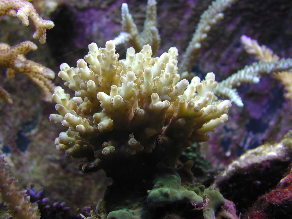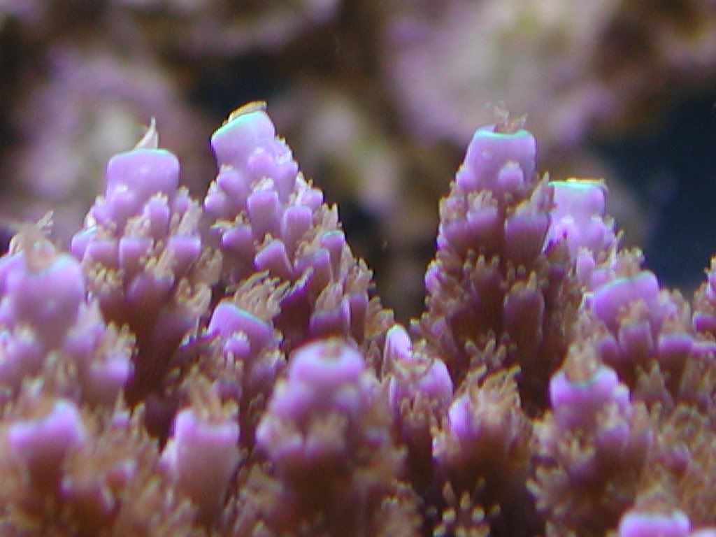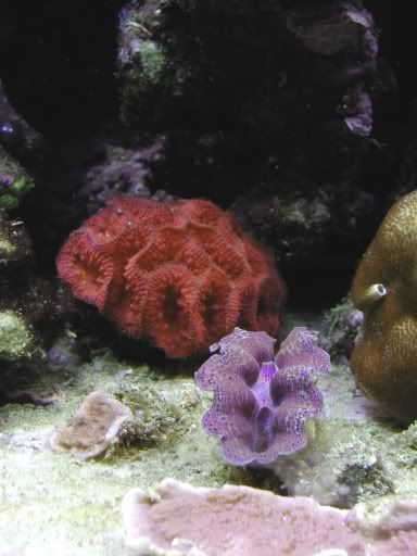 My red blastomussa is doing quite spectacularly, and I just included this pic because its such a gorgeous colour. My yellow bali acro is doing quite well, but what got me in this pic was the small blue acro in the lower left. Absolutely amazing, its really too bad its so damned small, I don't want to take the risk of prying it off the rock to move it, its had a rather hard life being so small, and at one point it got munched on by that damn crab and was a mere nubbin. Its slowly coming back and actually has new growth on it!