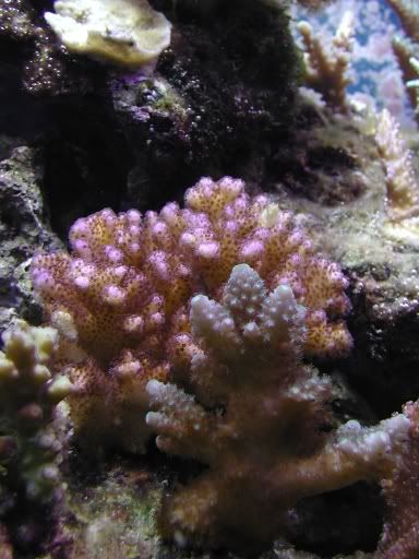 So some of my stuff is finally starting to color up. Its not really that obvious in the tank photo so I took some closeups of some of my favorite corals. This one is rather fuzzy and finally starting to color up. At some point last year it was really looking quite fabulous and then suddenly went to brown, now I'm seeing it return to its former glory and dang does it ever look cool!! This one is coloring up as well and somehow I seem to have 3 of them in my tank, from three different people. They all looked different in their tanks, however they've managed to become pretty much the same in mine. I'll still hold out for minute differences though :p My pink pocilipora damicornis has also become a glorious pink color and is pretty damned stunning.