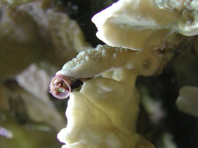 I thought this was kind of a cool photo. This bloody vermetid worm has been a total pain in the butt and I have tried to get rid of him several times. He has grown with the coral and the coral is now growing around his tube. Works for me as hopefully I can catch him unawares and cut him and his tube off of the coral. That nasty net he casts every day is a pain in the arse.